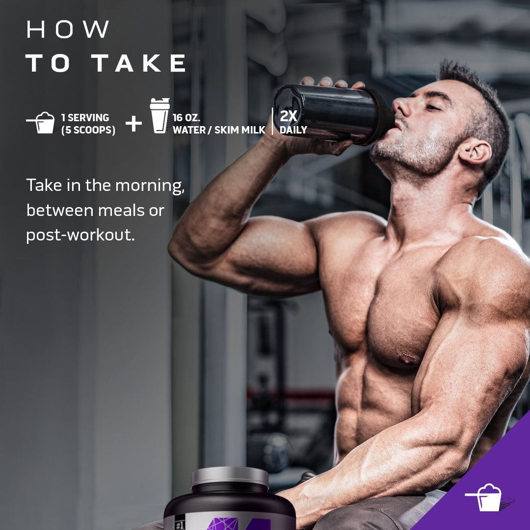 DIRECTIONS: Mix 1 serving (5 scoops) with 16 oz. of water or skim milk and consume twice daily, either in the morning, between meals or post-workout. For best results, use a blender. Drink 8 to 10 glasses of water daily for general good health. Read the entire label before use and follow directions provided.