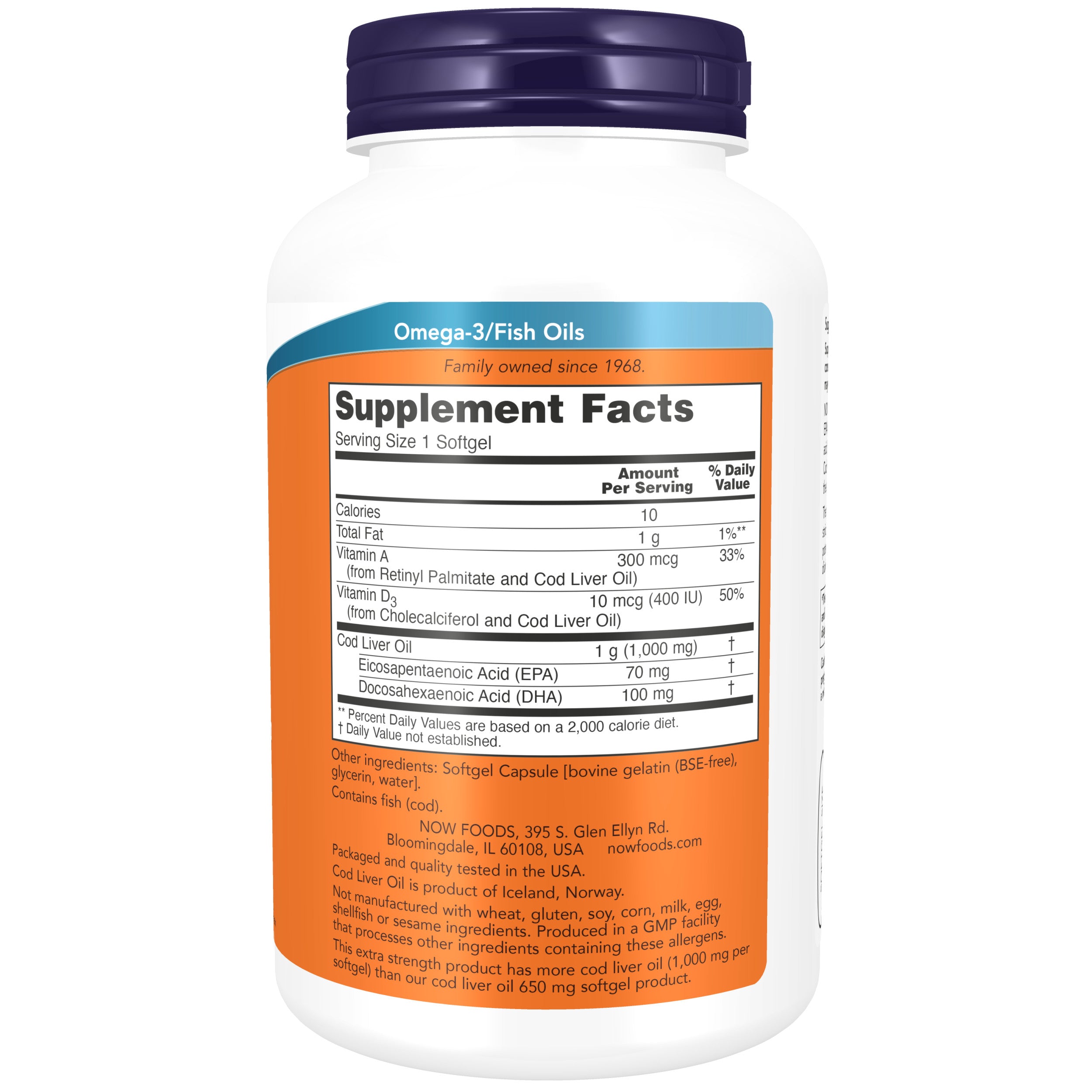 NOW® Cod Liver Oil abounds in omega-3 fatty acids, EPA (eicosapentaenoic acid) and DHA (docosahexaenoic acid). It is also an excellent source of vitamins A and D-3. Cod liver oil has a long history of traditional use for the support of overall health and well-being.* The cod liver oil used in this softgel is manufactured under strict quality control standards. It is tested to be free of potentially harmful levels of contaminants such as PCBs, dioxins, mercury and other heavy metals. From the FDA: "Supportive but not conclusive research shows that consumption of EPA and DHA omega-3 fatty acids may reduce the risk of coronary heart disease." This extra strength product has more cod liver oil (1,000 mg per softgel) than our cod liver oil 650 mg softgel product. Natural colour variation may occur in this product.