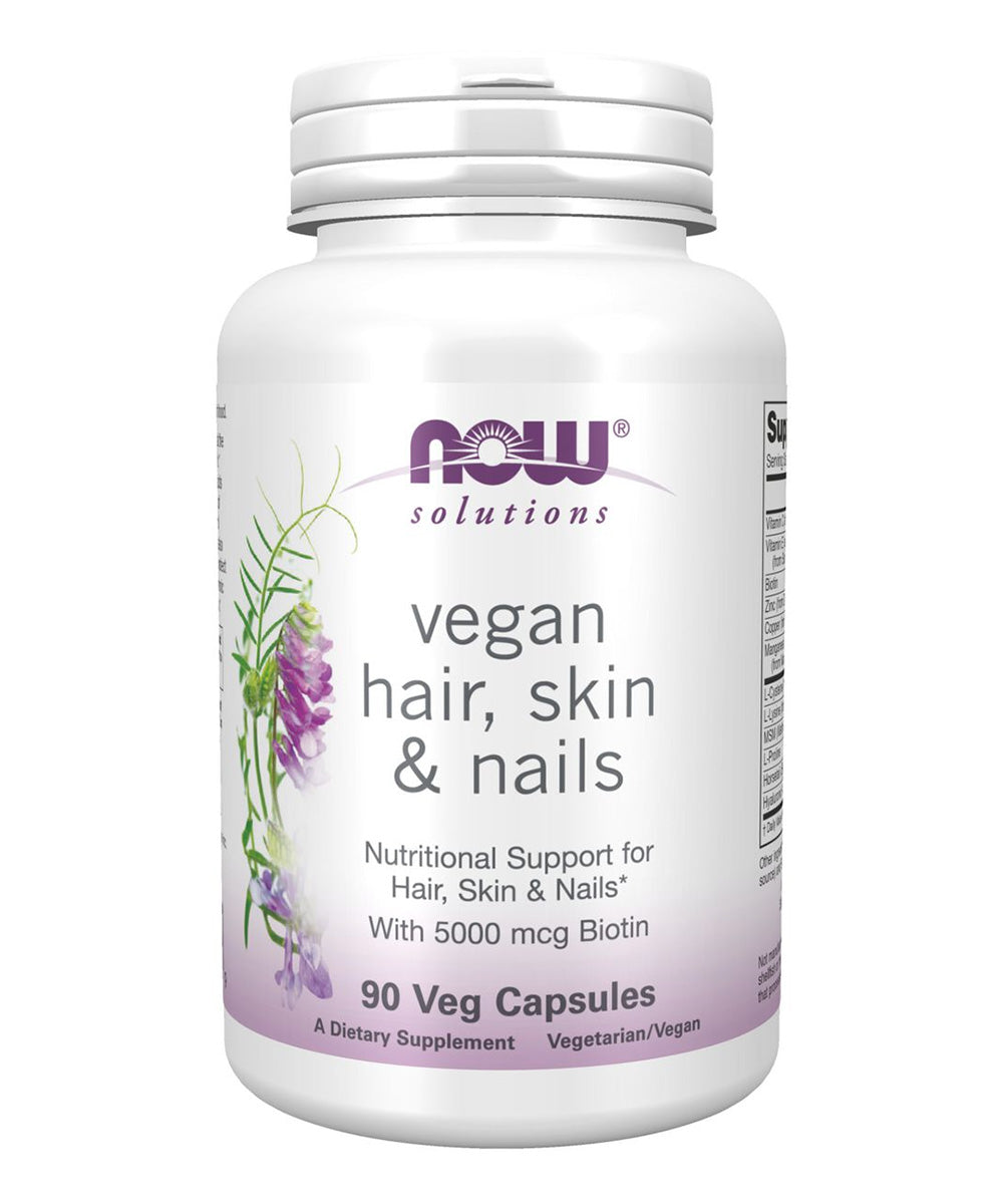 NOW Solutions Vegan Hair, Skin & Nails works at the cellular level to promote natural beauty from within. This completely vegan formula offers the amino acids and minerals that are essential for the production of collagen and keratin, which are the main structural components of hair, skin, and nails. This formula also has the antioxidant vitamins C and E, which help protect skin from free radicals, as well as biotin and hyaluronic acid, which can also support healthy, youthful skin.