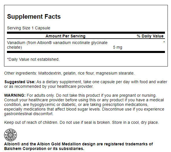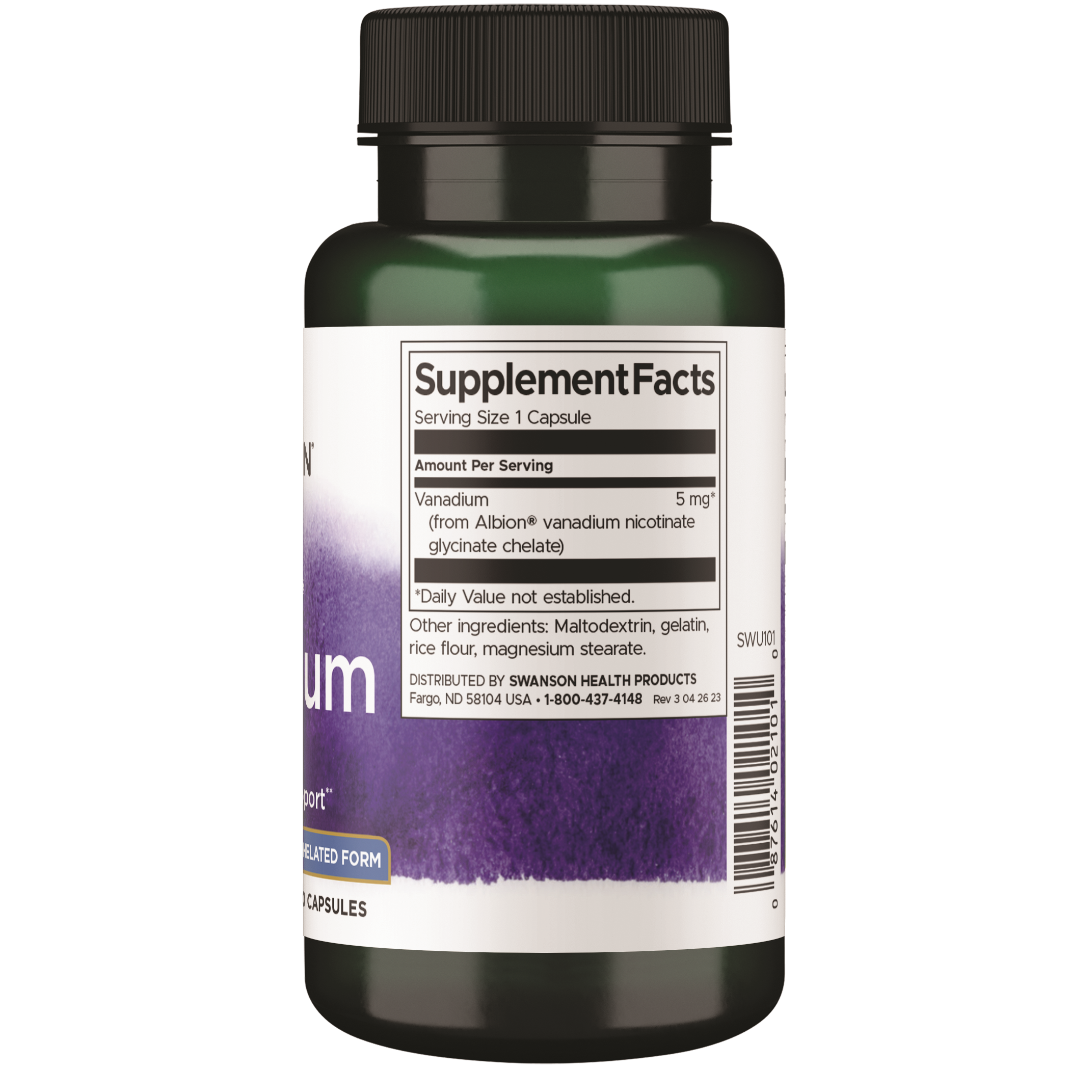 Swanson Vanadium is helpful for promoting healthy carbohydrate metabolism. Classified as a trace mineral because it is needed only in small amounts, each capsule contains 5 mg of chelated vanadium from Albion, the leaders in supplemental mineral chelates.