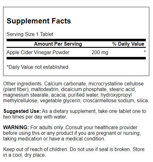 A popular supplement among dieters, Swanson Best Weight-Control Formulas Apple Cider Vinegar can benefit just about anybody! This special formula packs all of the goodness of pure apple cider vinegar into handy, traveler-friendly tablets. Apple cider vinegar is popular in weight management and detoxification regimens as it may support healthy glucose metabolism.